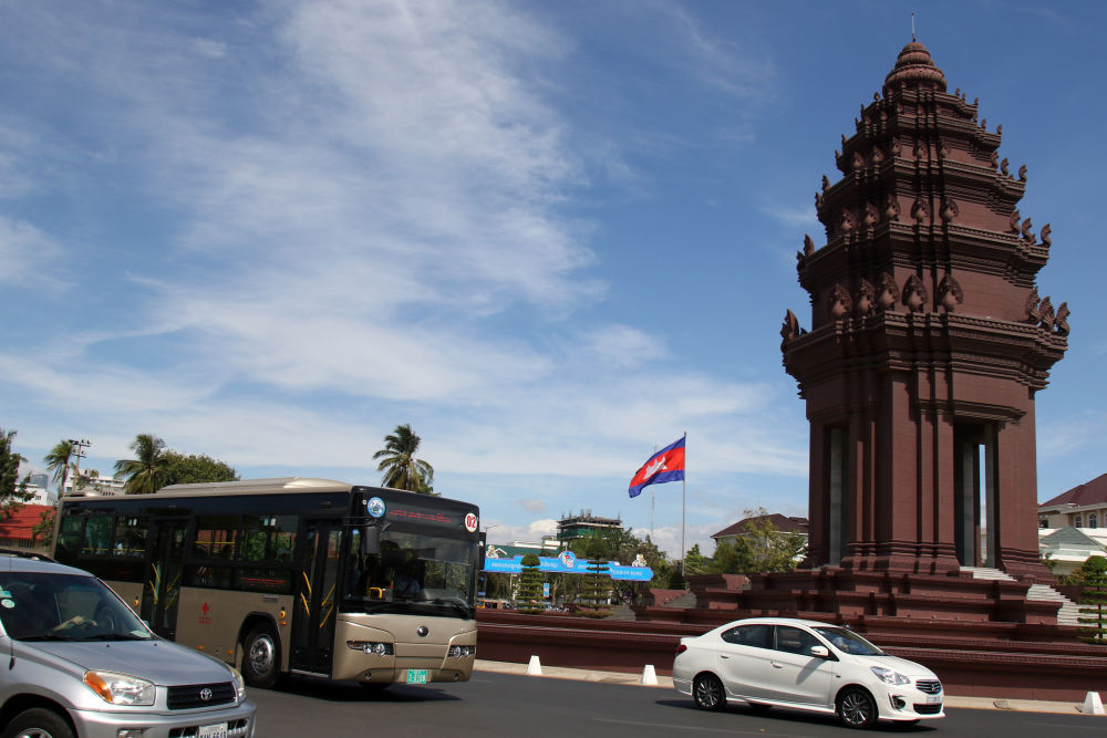 2018年1月5日,在柬埔寨金邊,一輛中國援助的“宇通”公交車經過獨立紀念碑。