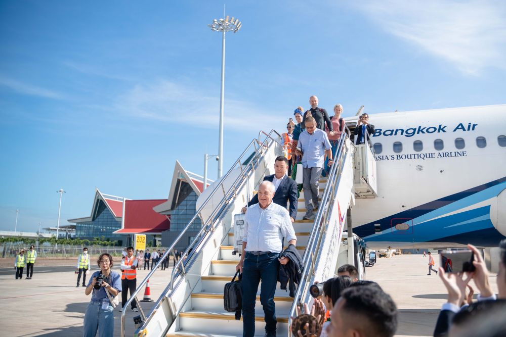 2023年10月16日,由中國企業在海外以“BOT模式(建設-運營-移交)”建設的柬埔寨暹粒吳哥國際機場通航運營。這是該機場首架進港客機乘客走下飛機。