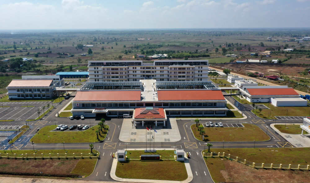 2022年2月17日在柬埔寨特本克蒙省新區拍攝的中國援柬埔寨特本克蒙省醫院。