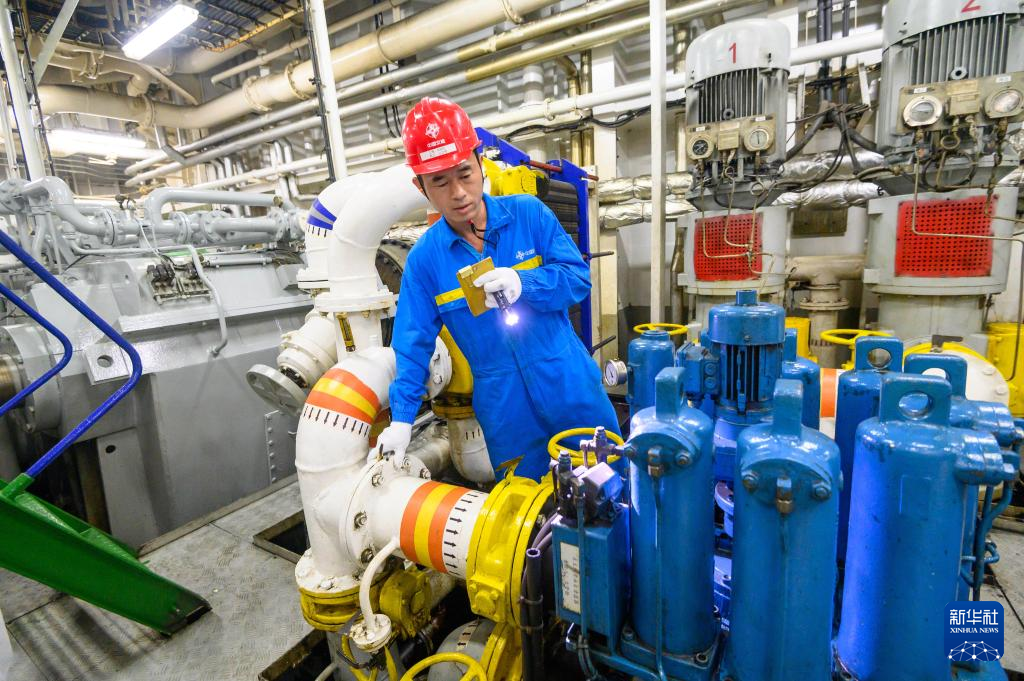 3月13日,在馬來西亞雪蘭莪州巴生,"新海鳳"輪輪機長蔡國漢檢查機艙設備,以確保船舶安全航行。新華社發(張紋綜攝)