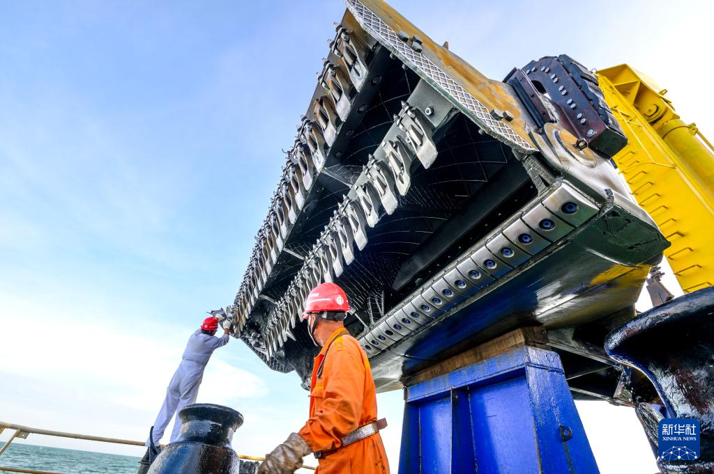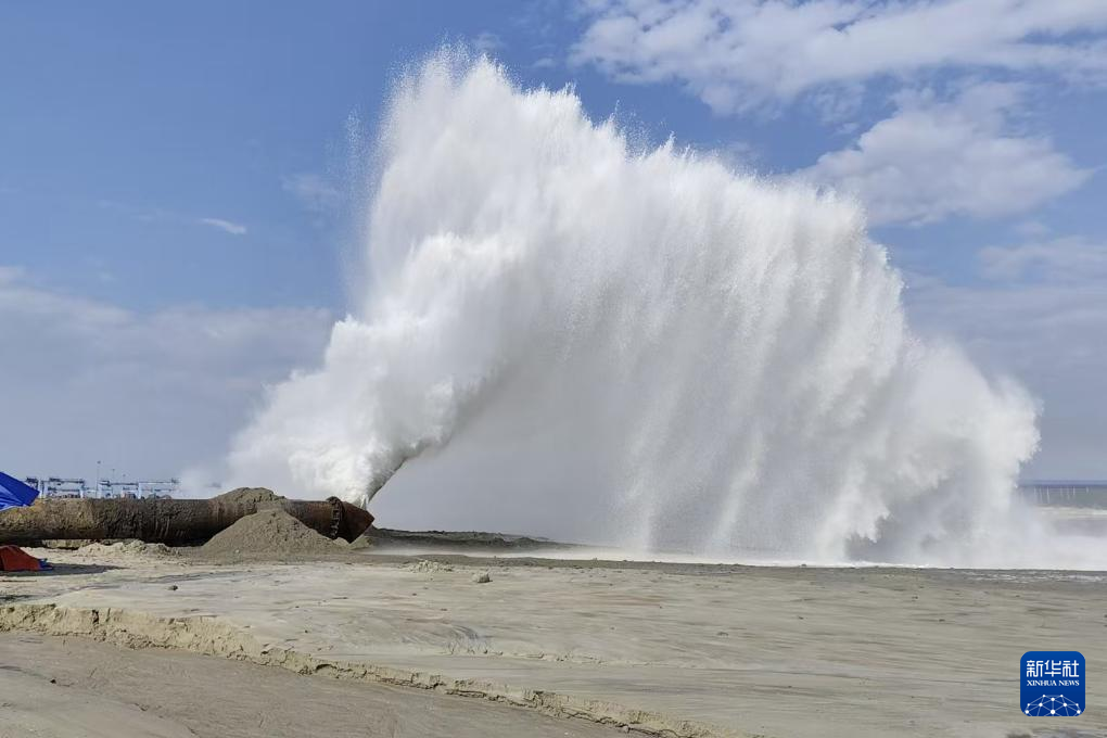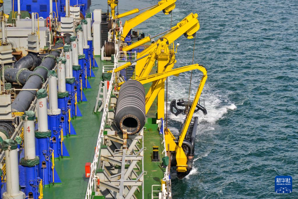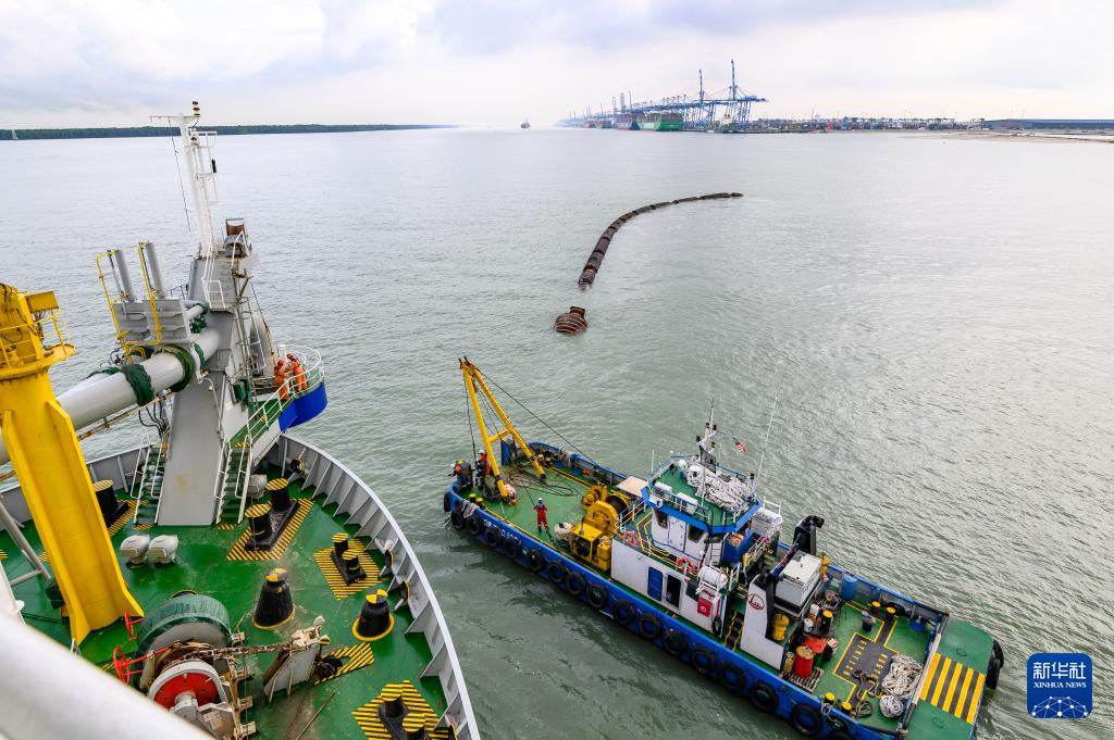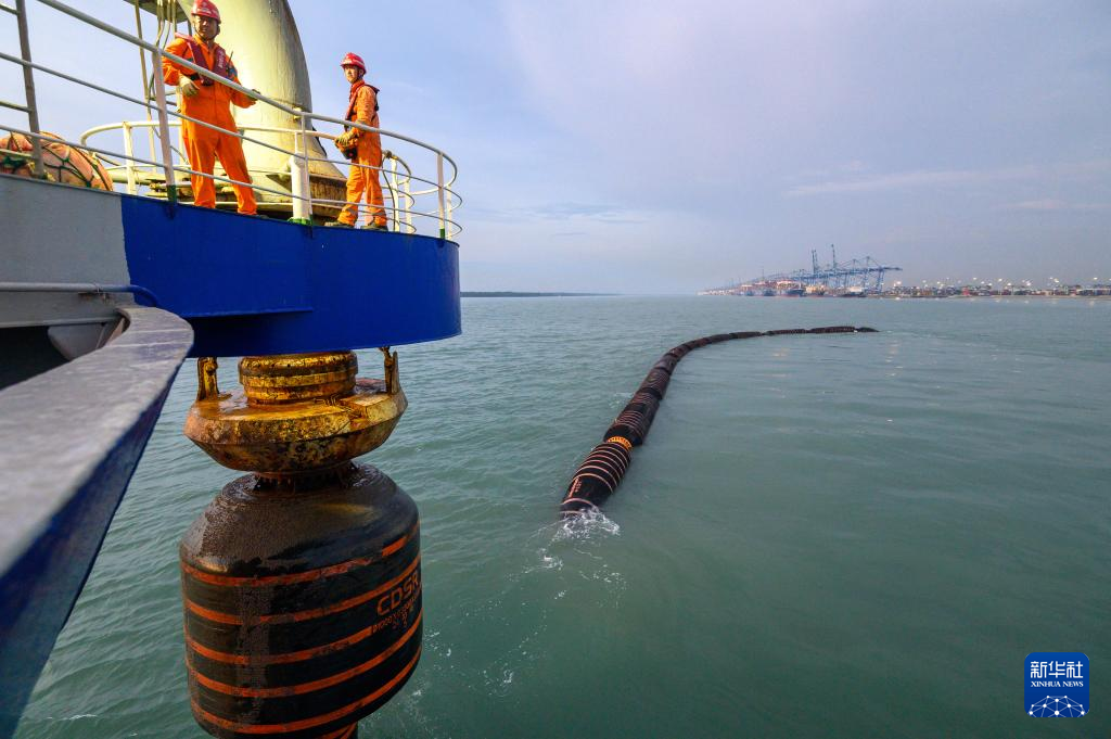 3月12日,在馬來西亞雪蘭莪州巴生,“新海鳳”輪的雙耙下水取砂。新華社發(張紋綜攝)