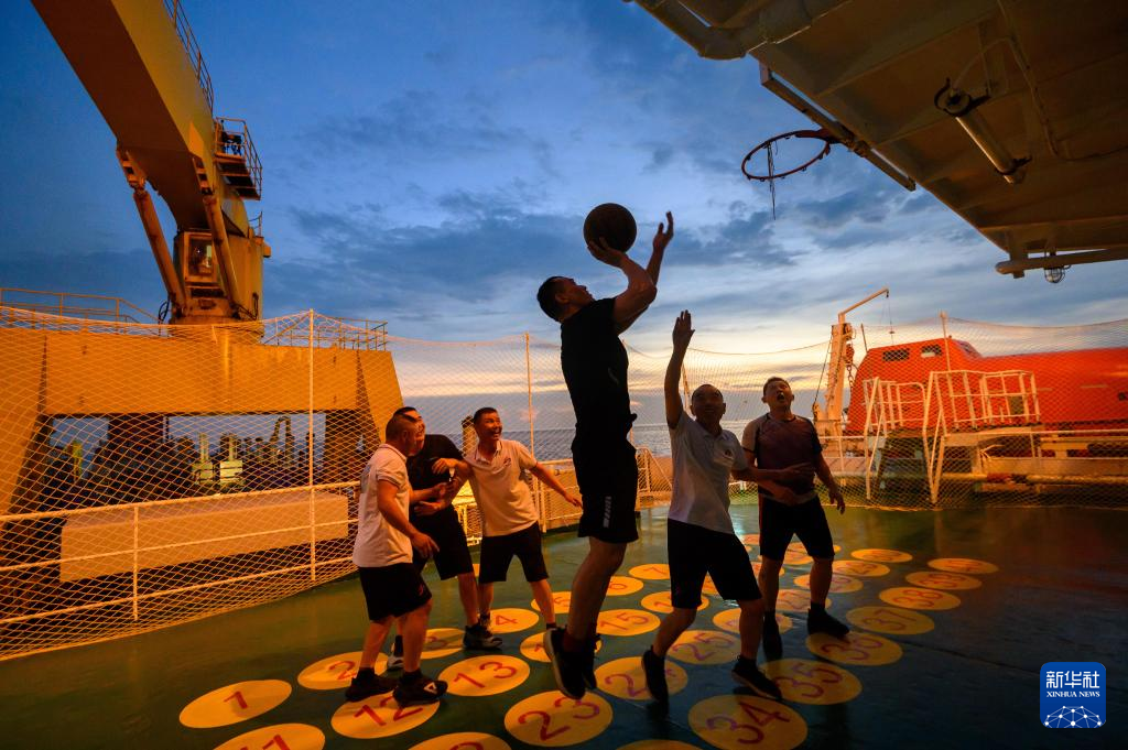 3月13日,在馬來西亞雪蘭莪州巴生,"新海鳳"輪的船員們在甲板上打籃球。新華社發(張紋綜攝)