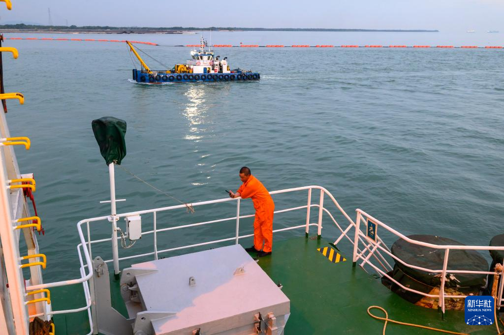 3月13日,在馬來西亞雪蘭莪州巴生,“新海鳳”輪船員進行雙粑維護。新華社發(張紋綜攝)