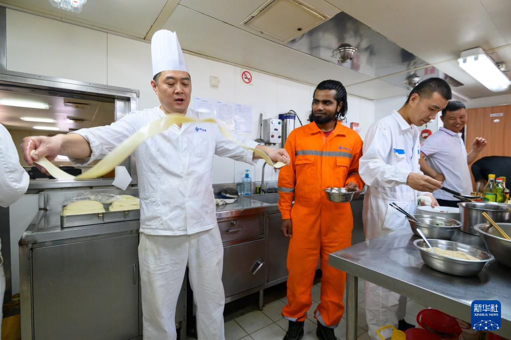 3月13日,在馬來西亞雪蘭莪州巴生,"新海鳳"輪上的廚師為船員們準備餐食。新華社發(張紋綜攝)