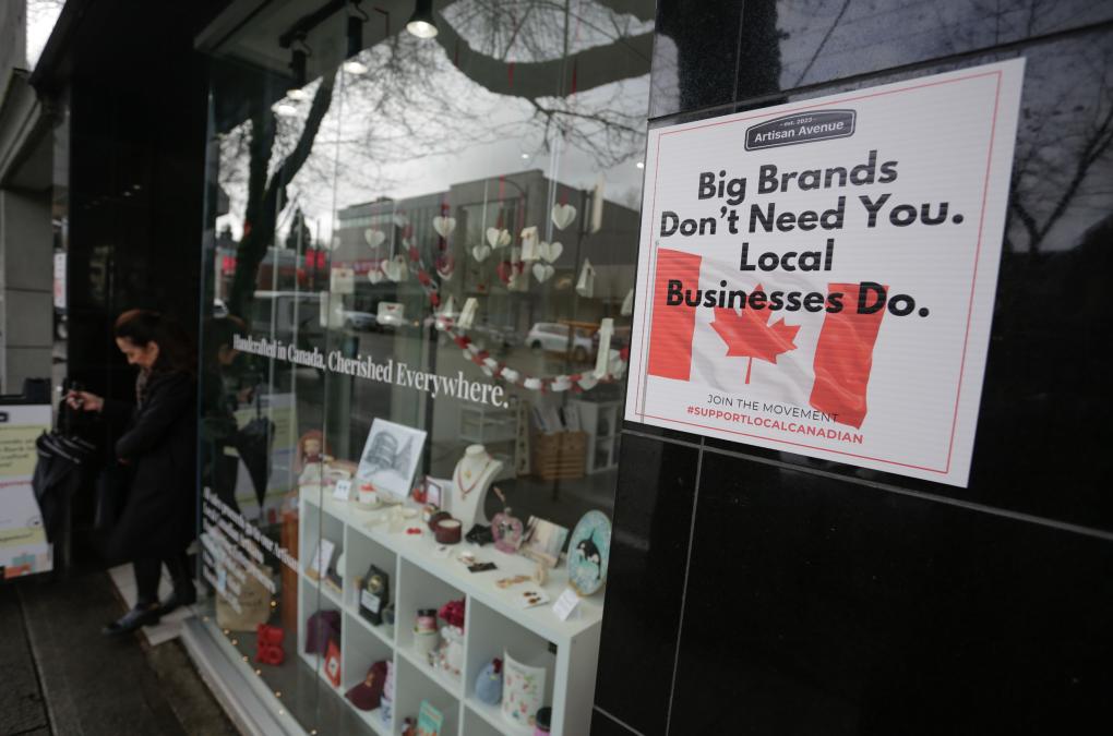 2月25日,加拿大溫哥華一家商店外張貼著宣傳本地企業的標牌。新華社發(梁森攝)