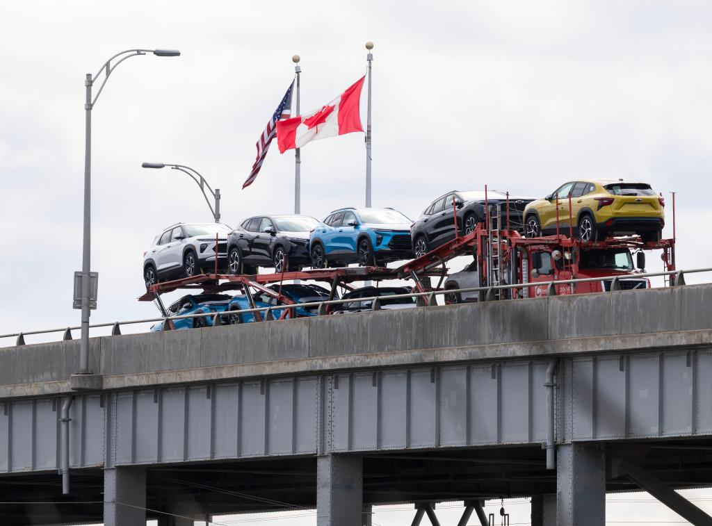 4月9日,在加拿大安大略省尼亞加拉瀑布市加美邊境地帶,一輛滿載的汽車運輸車通過劉易斯頓-昆斯頓橋開往加拿大。新華社發(鄒崢攝)