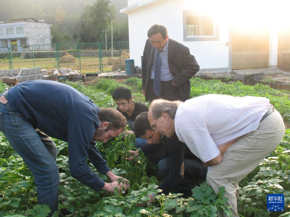 2012年,在重慶市巫溪縣,比利時農學家弗朗索瓦·塞爾內爾(右一)在田間觀察土豆的生長情況。新華社發
