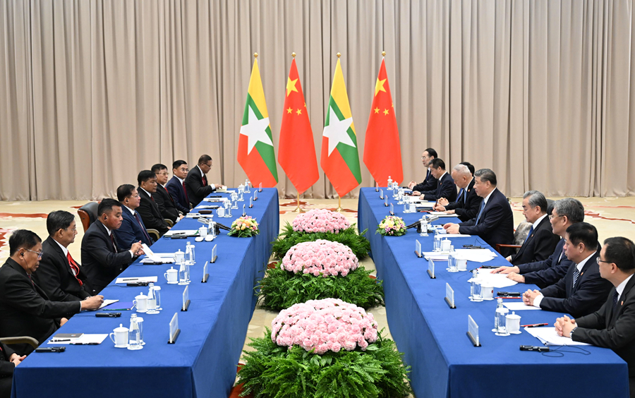 習近平指出,中緬是同甘共苦、守望相助的命運共同體。中緬兩國共同倡導的和平共處五項原則和萬隆精神歷久彌堅,時代價值不斷凸顯。今年是兩國建交75周年,中方將秉持睦鄰、安鄰、富鄰、親誠惠容、命運與共的理念方針,同緬方深化命運共同體建設,高質量共建“一帶一路”,落實好全球發展倡議、全球安全倡議、全球文明倡議,給兩國人民帶來更多福祉。前不久,緬甸曼德勒強烈地震造成重大人員傷亡和財產損失,中方最早派出救援力量,援助緊急人道主義物資,愿繼續提供幫助,支持緬方重建家園。中方支持緬甸走符合本國國情的發展道路,維護主權獨立、領土完整、國家穩定,穩妥推進國內政治議程。雙方要深化戰略合作,持續推進中緬經濟走廊重點項目建設。希望緬方切實保障在緬中方人員、機構、項目安全,加力打擊網賭電詐等跨境犯罪。雙方要共同捍衛以聯合國為核心的國際體系和以國際法為基礎的國際秩序,維護發展中國家正當權益。