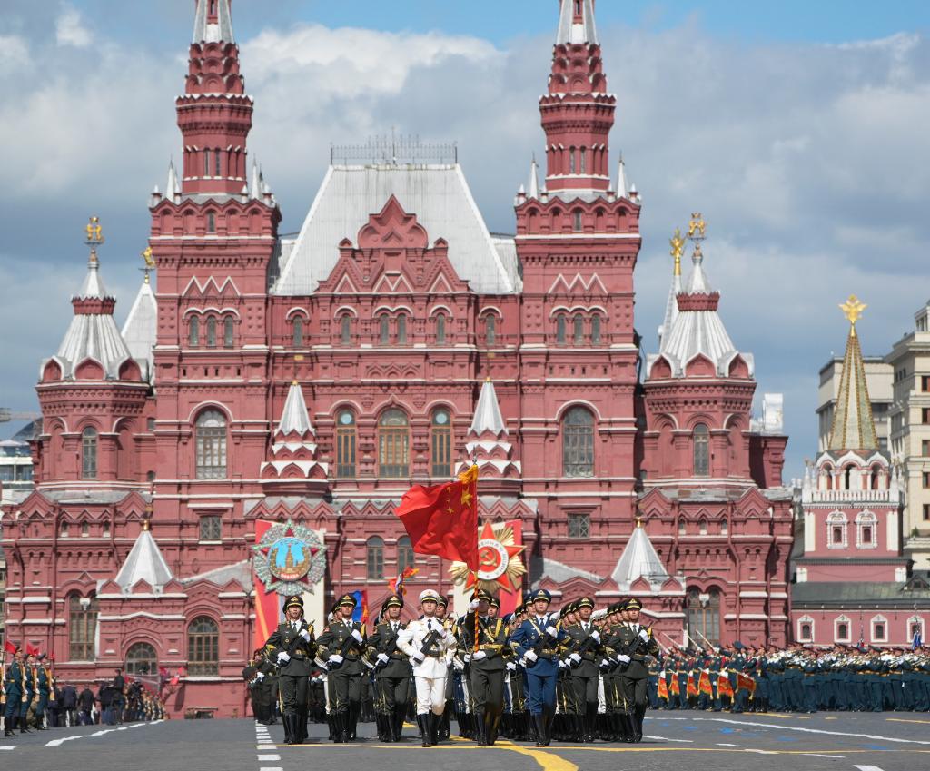 慶典上,中國人民解放軍三軍儀仗隊方隊軍容嚴整、士氣高昂,邁著堅定有力的步伐走過紅場。