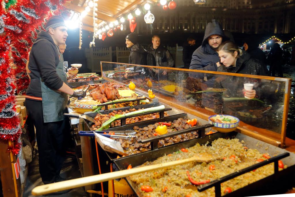 2024年11月29日,人們在羅馬尼亞首都布加勒斯特的圣誕集市上品嘗美食。新華社發(克里斯泰爾攝)