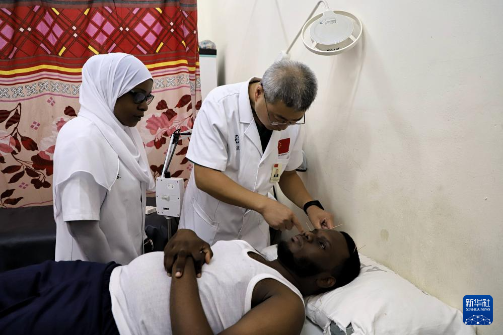 5月6日,在坦桑尼亞桑給巴爾,第34期中國援桑給巴爾醫療隊的中醫大夫李登科(右)與當地護士為患者針灸。新華社記者 華洪立 攝