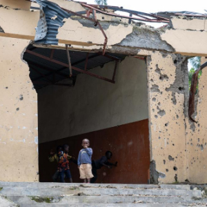 這是5月11日在剛果(金)東部小鎮薩凱周邊地區拍攝的因沖突嚴重損毀的學校。新華社記者 鄭揚子 攝