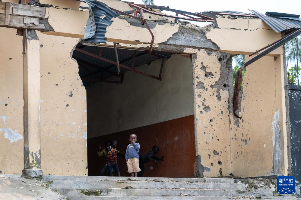 5月11日,在剛果(金)東部小鎮薩凱,幾名兒童在因沖突損毀的房屋下玩耍。新華社記者 鄭揚子 攝