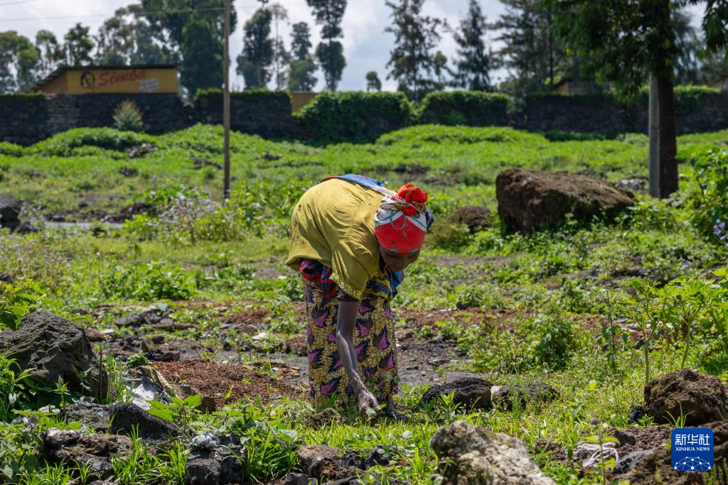 5月6日,在剛果(金)東部北基伍省戈馬市郊,雅納在路邊的草叢里尋找馬齒莧充饑。新華社記者 鄭揚子 攝