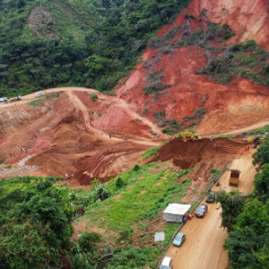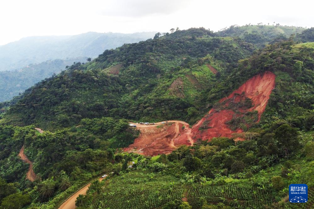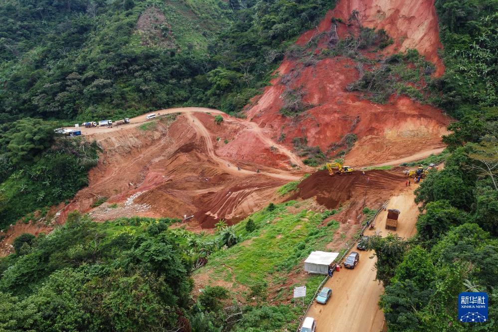 這是4月22日拍攝的喀麥隆西部大區姜村懸崖公路山體滑坡路段施工現場(無人機照片)。 新華社發(科普索攝)