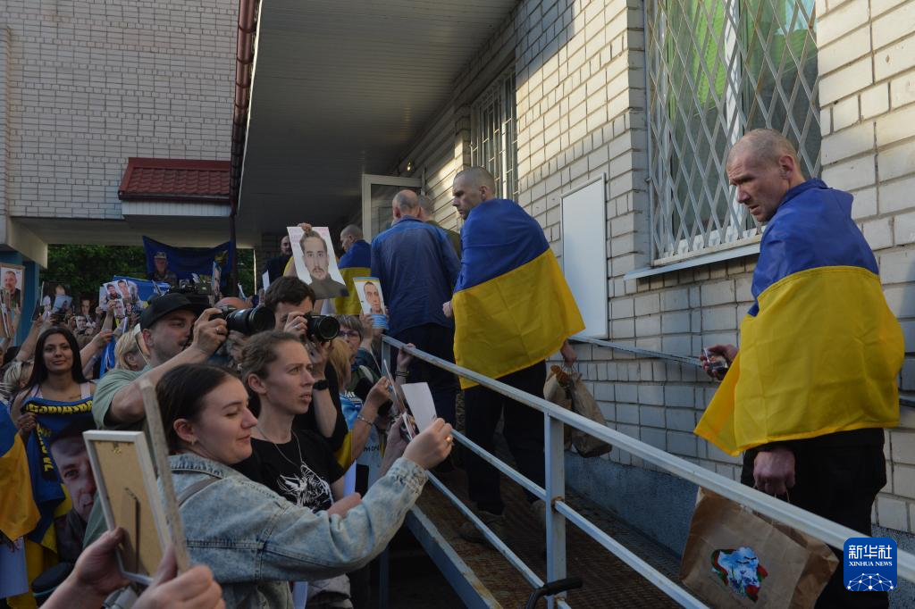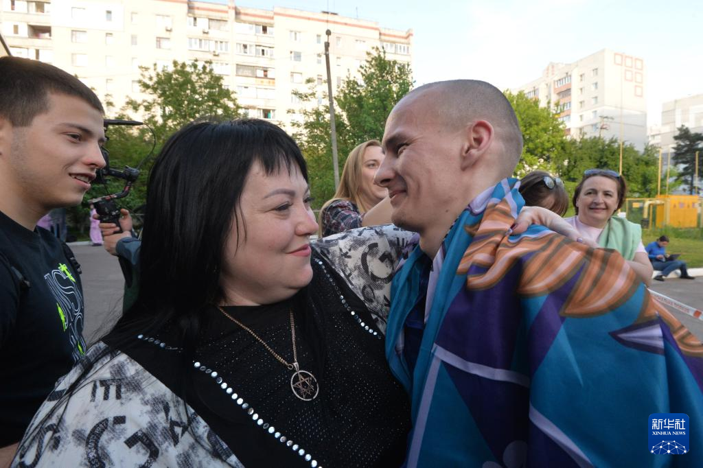 5月23日,一名被釋放的烏克蘭軍人與親人擁抱。新華社發(彼得·德魯克攝)
