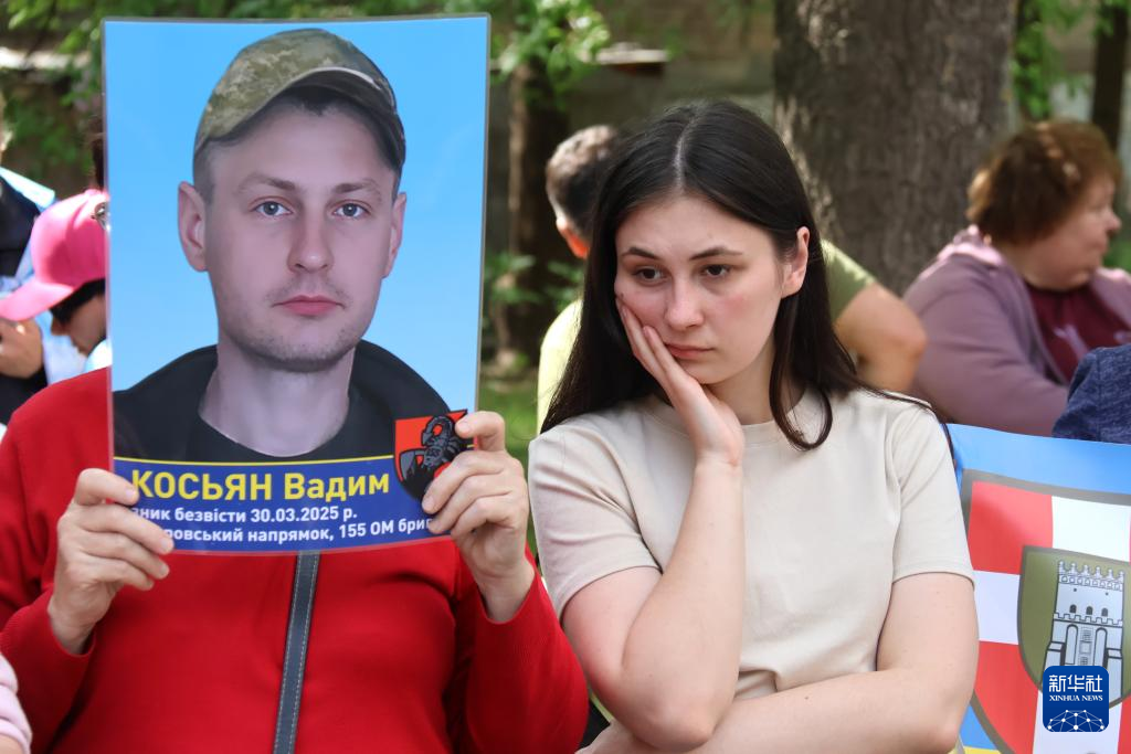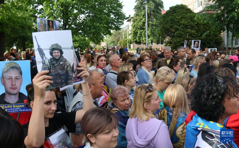 5月23日,烏克蘭民眾舉著失蹤軍人照片向被釋放烏軍人詢問下落。新華社發(彼得·德魯克攝)