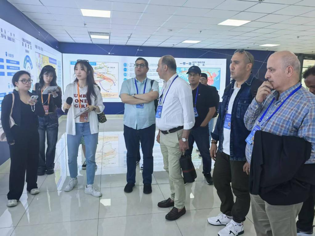 5月26日,媒體團外賓在新疆烏魯木齊國際陸港區了解中歐班列發運情況。新華社記者顧煜 攝