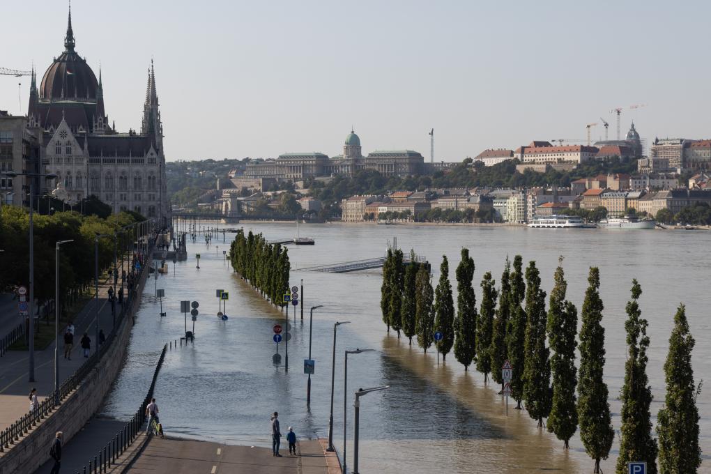 2024年9月19日,在匈牙利首都布達佩斯,人們查看水位上漲的多瑙河。新華社發(弗爾季·奧蒂洛攝)