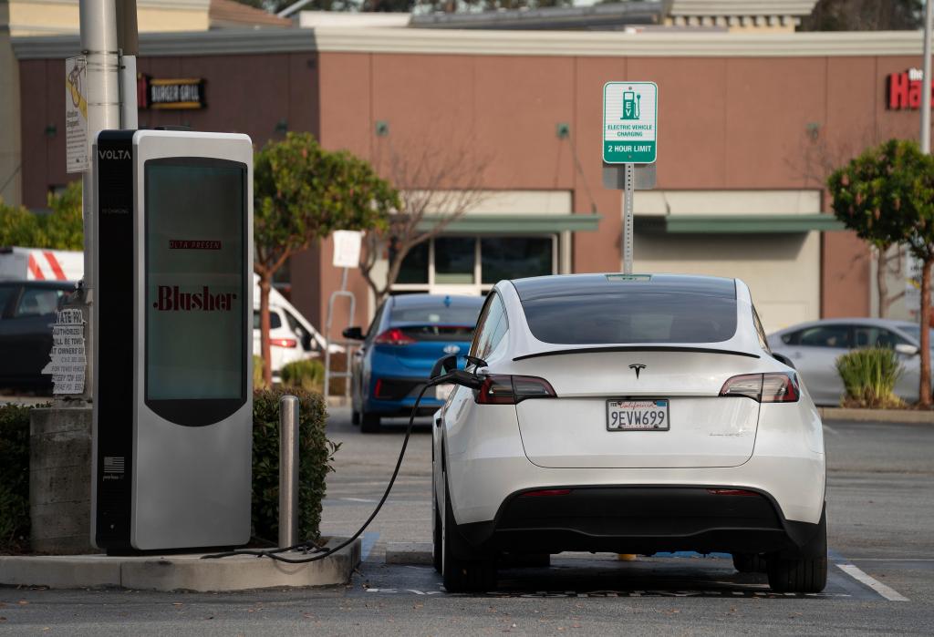 2023年12月13日,一輛特斯拉電動車在美國加利福尼亞州圣馬特奧縣一處停車場充電。新華社發(李建國攝)