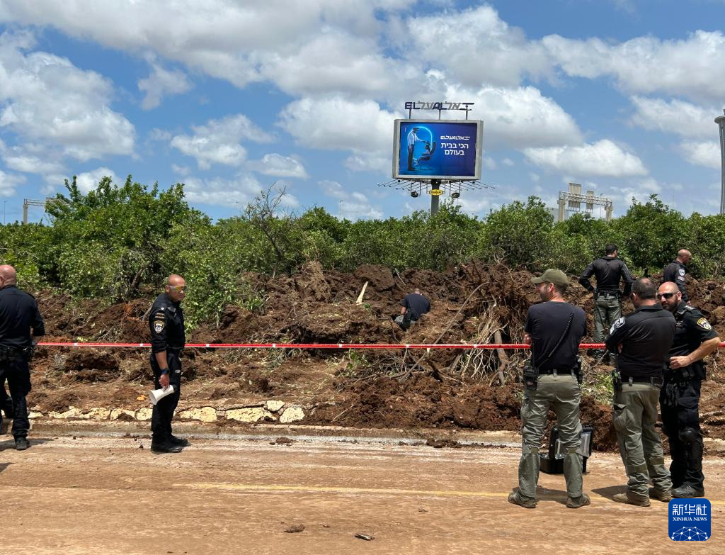 5月4日,在以色列本·古里安國際機場附近,警方在遭導彈襲擊的區域工作。當天,也門胡塞武裝向該機場發射了一枚高超音速導彈。以色列啟用遠程“箭”式反導系統與美軍部署的“薩德”反導系統聯合攔截,未能阻止導彈落地,爆炸點距航站樓僅300多米。新華社發(吉爾·科恩·馬根攝)
