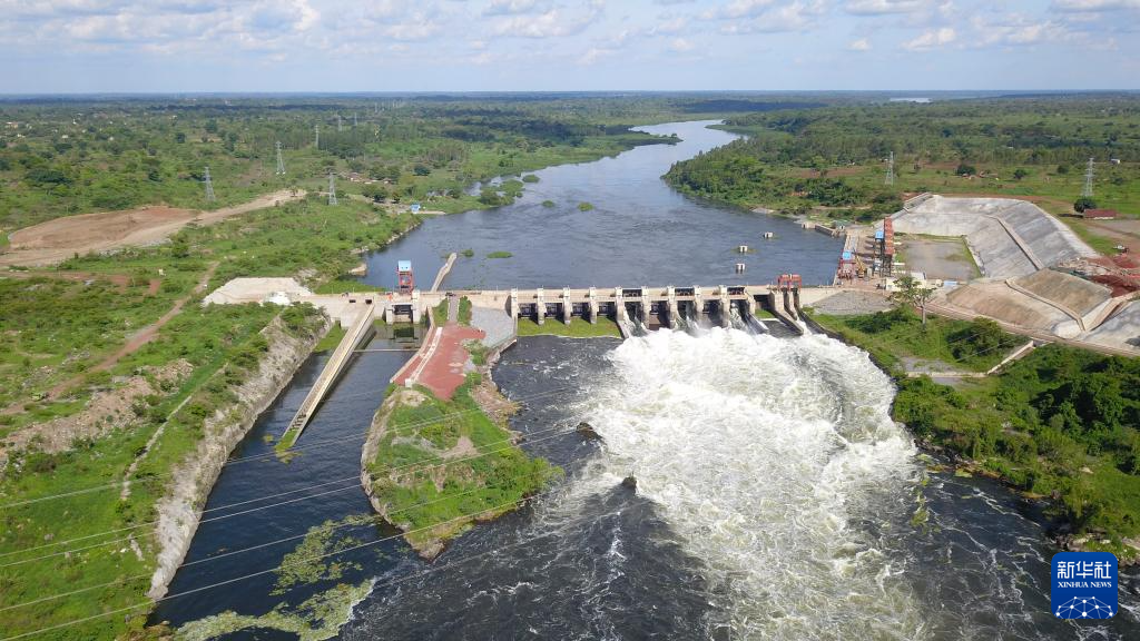 這是2023年12月14日拍攝的位于白尼羅河上的烏干達卡魯瑪水電站(無人機照片)。新華社發(王劍攝)