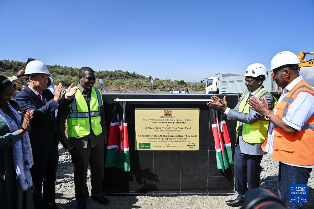 2024年10月24日,在肯尼亞納庫魯郡,肯尼亞總統威廉·魯托(右二)出席梅嫩加伊地熱開發項目一期Orpower 22地熱電站開工儀式。新華社記者 韓旭 攝