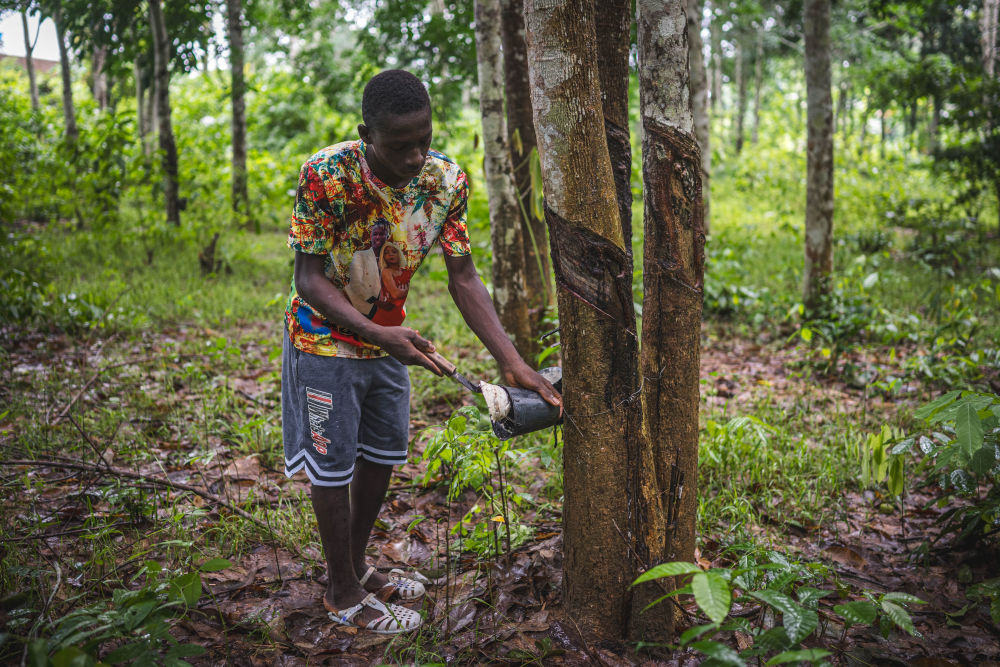 2025年5月30日,橡膠種植戶在科特迪瓦圣佩德羅省大貝雷比鎮收割橡膠。新華社記者 王冠森 攝