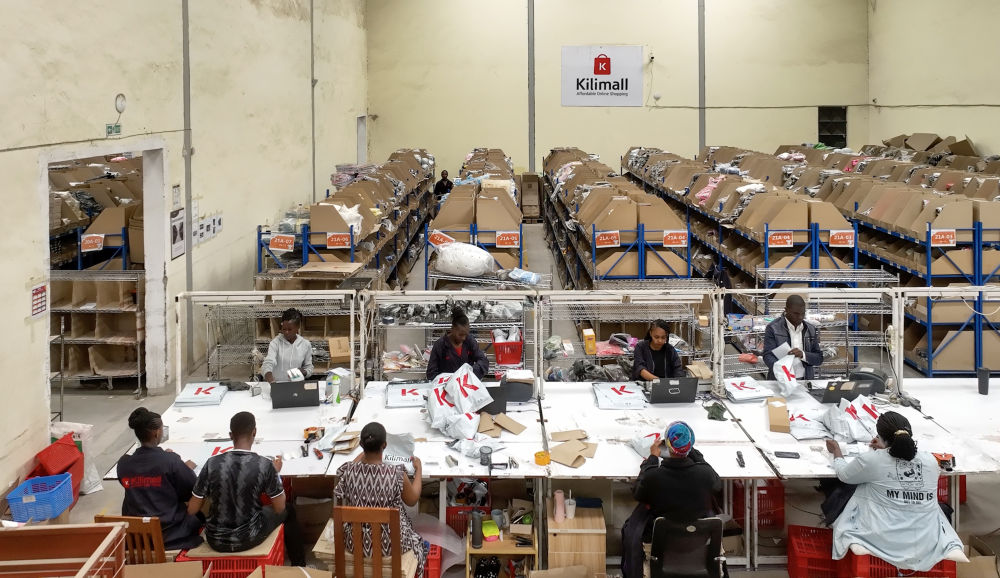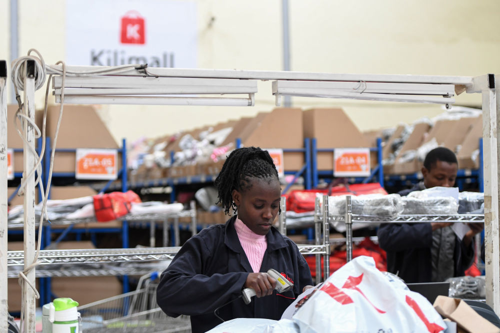 2023年4月20日,在肯尼亞姆洛隆戈,Kilimall員工在倉庫內包裝商品出庫。新華社發(辜鵬博攝)