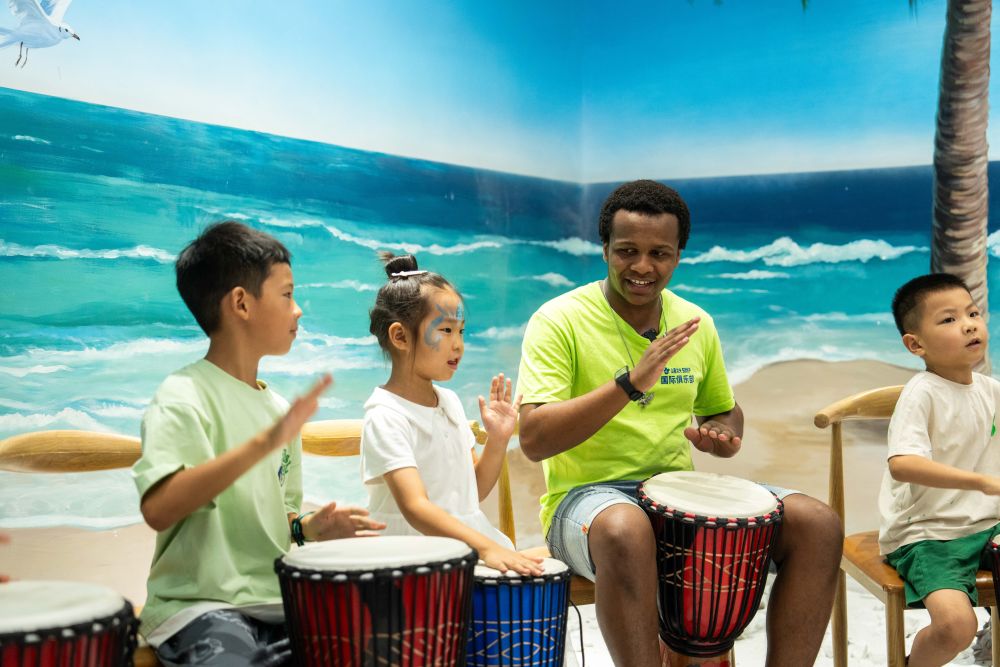 2024年8月30日,在位于湖南高橋大市場的中非經貿博覽會常設展館安哥拉館,志愿者(右二)帶領學生學習非洲鼓。新華社記者 陳思汗 攝
