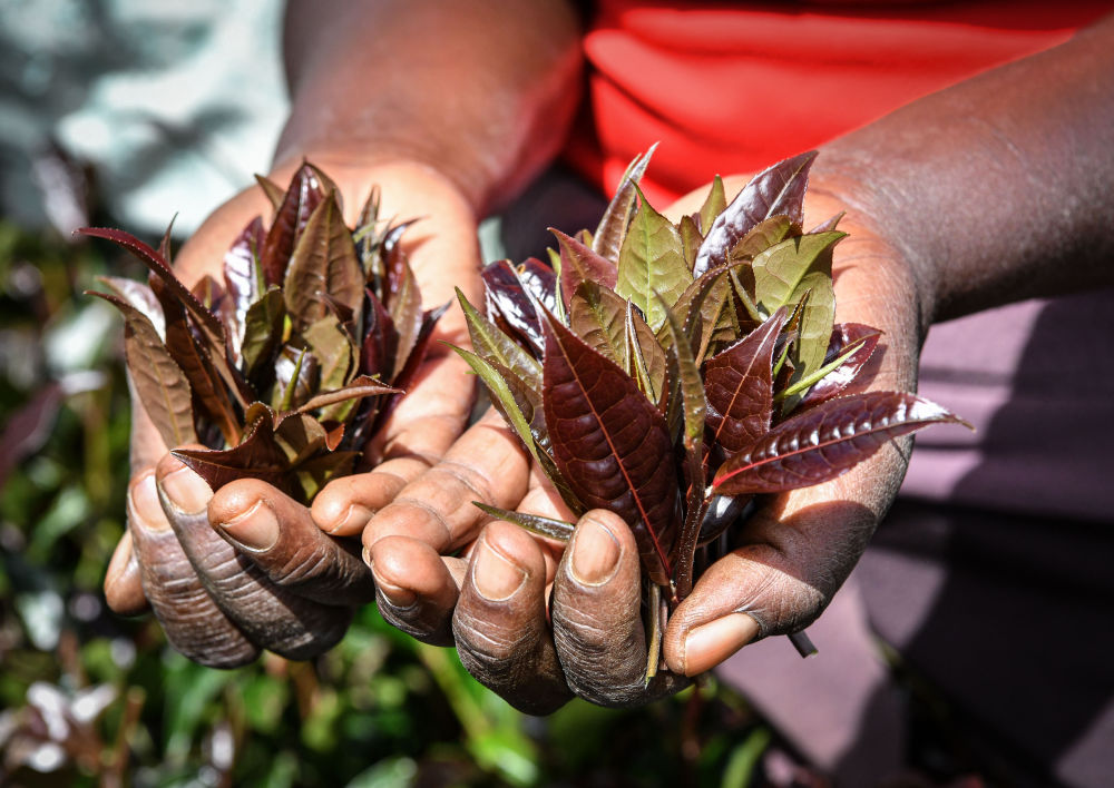 2024年5月6日,在肯尼亞穆拉雅郡的一處紫茶園,茶農展示采摘下來的紫茶。新華社記者 韓旭 攝