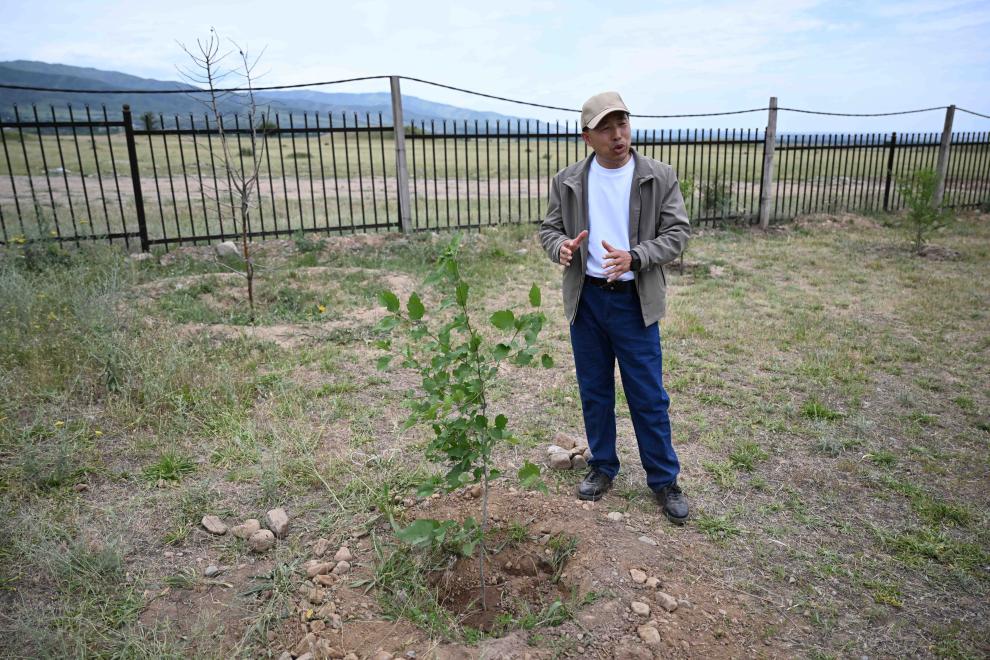 6月3日,在哈薩克斯坦伊塞克國家歷史文化博物館附近,丁巖介紹中哈聯合考古隊一起種下的山楂樹。新華社記者 李任滋 攝