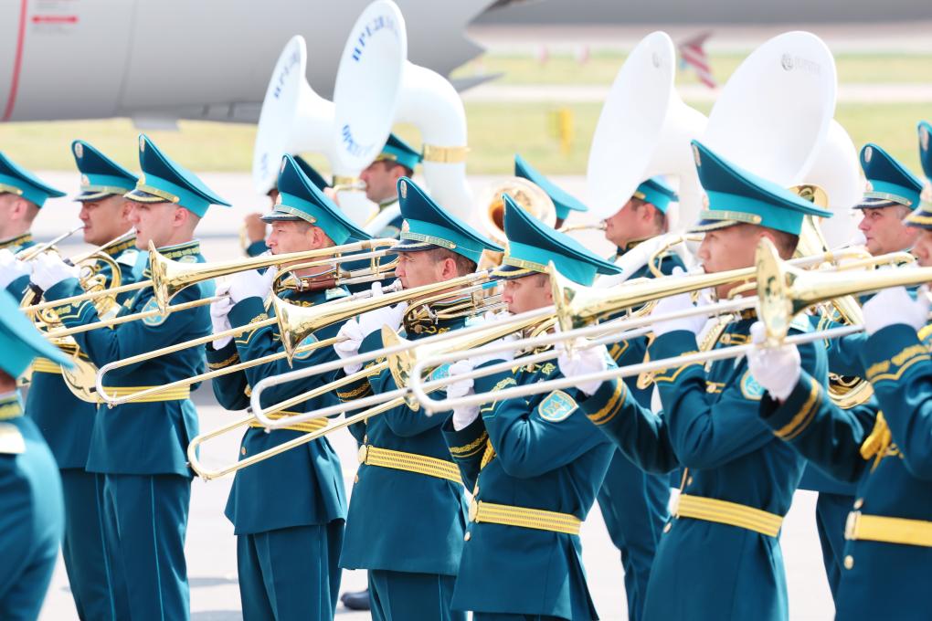 禮兵分列藍地毯兩側致敬,哈薩克斯坦少年兒童手持中哈兩國國旗熱烈歡迎習近平到訪。