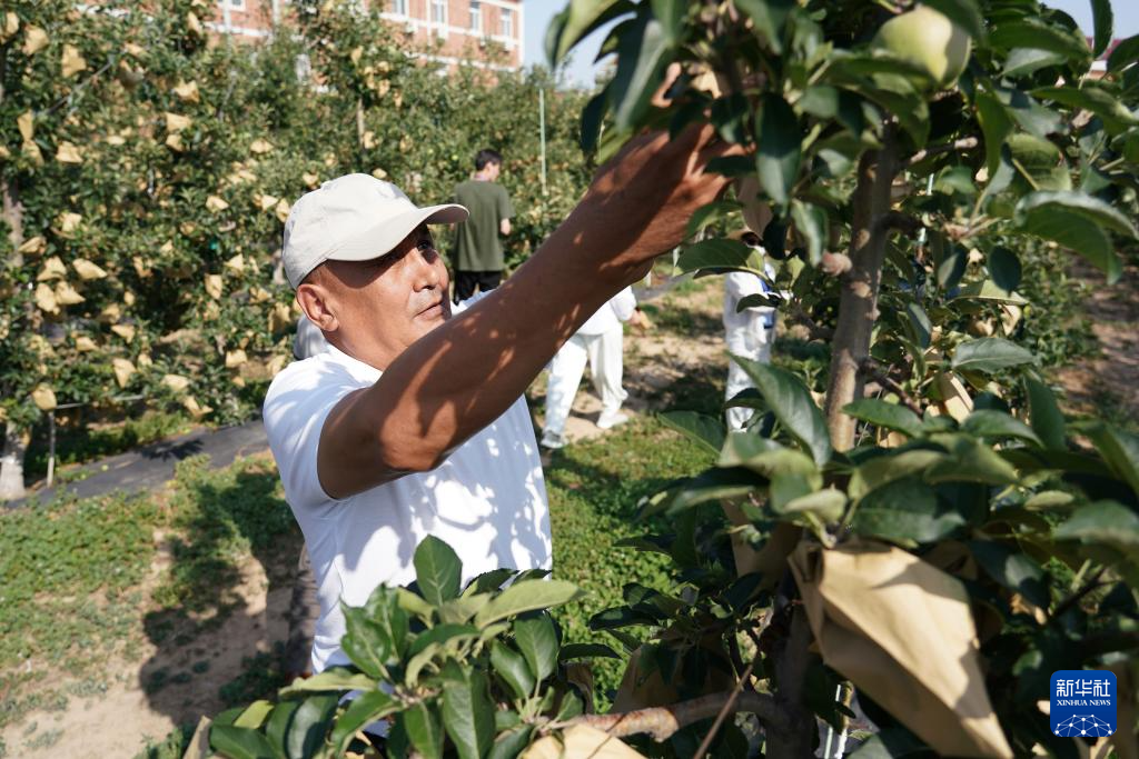 6月16日,培訓班學員在位于陜西省渭南市白水縣的西北農林科技大學蘋果試驗站體驗蘋果套袋。