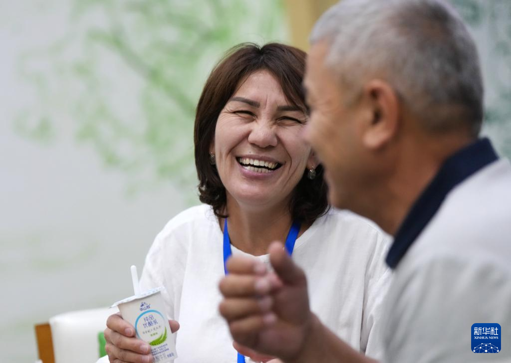 6月17日,培訓班哈薩克斯坦籍學員紹哈耶娃·薩吾麗(左)和烏巴耶夫·阿爾濟馬特在位于陜西省渭南市的中墾華山牧乳業有限公司品嘗乳制品。