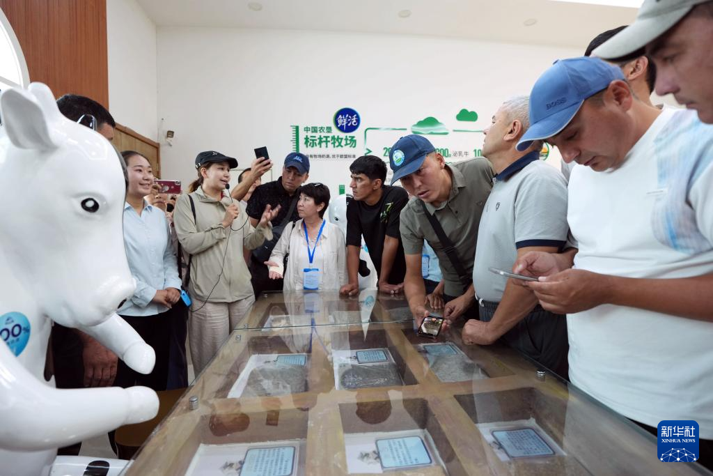 6月17日,培訓班哈薩克斯坦籍學員紹哈耶娃·薩吾麗(右)和烏巴耶夫·阿爾濟馬特在位于陜西省渭南市的中墾華山牧乳業有限公司了解奶牛飼料。