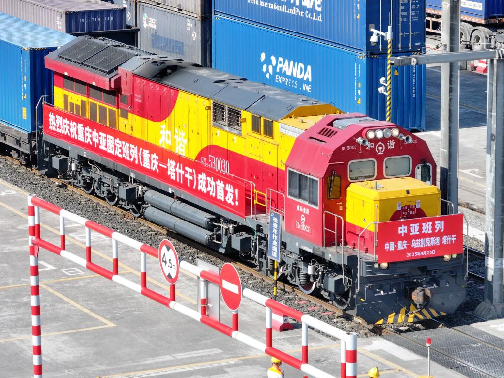 4月20日,圖定中亞班列在重慶團結村中心站等候發車(無人機照片)。新華社記者 唐奕 攝