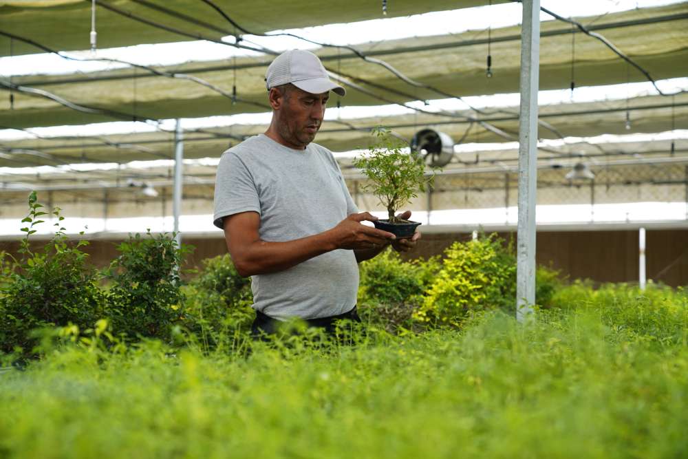 2024年7月28日,在烏茲別克斯坦錫爾河州的上合組織農業基地中烏現代農業科技示范園,工作人員檢查盆栽植物。新華社發(扎法爾攝)
