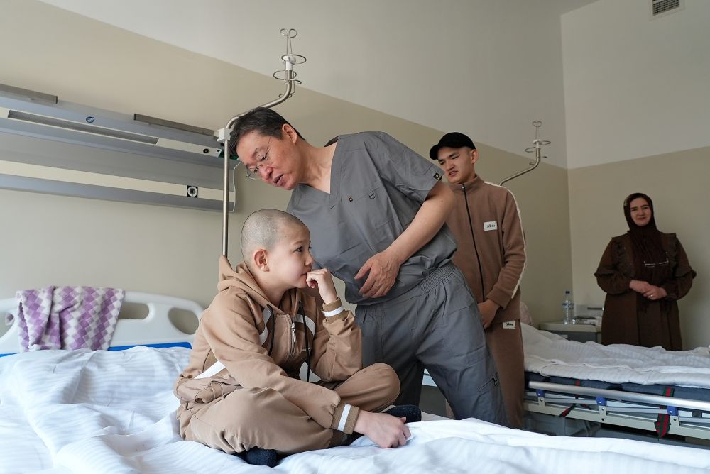 2025年2月20日,在位于烏茲別克斯坦塔什干的共和國耳鼻喉科及頭頸疾病專業科學實踐醫療中心,劉玉和醫生(左二) 在術前查看患兒情況。新華社發(扎法爾攝)