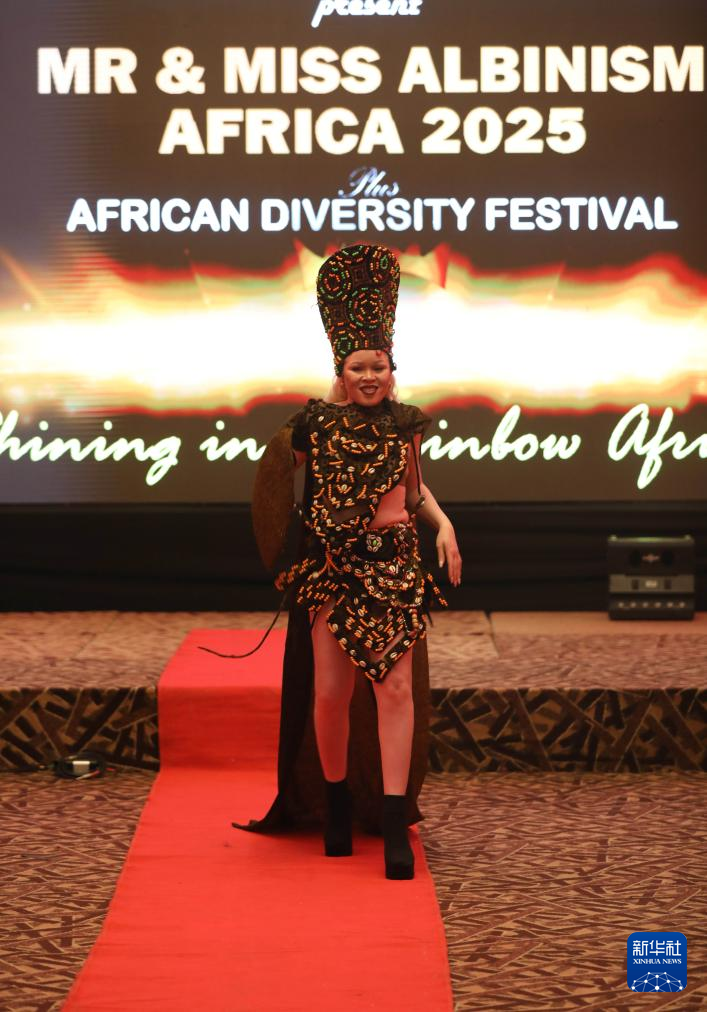 6月28日,一名選手在津巴布韋首都哈拉雷舉行的“非洲白化病先生和小姐”選美比賽中展示服裝。新華社發(肖恩·朱薩攝)