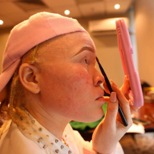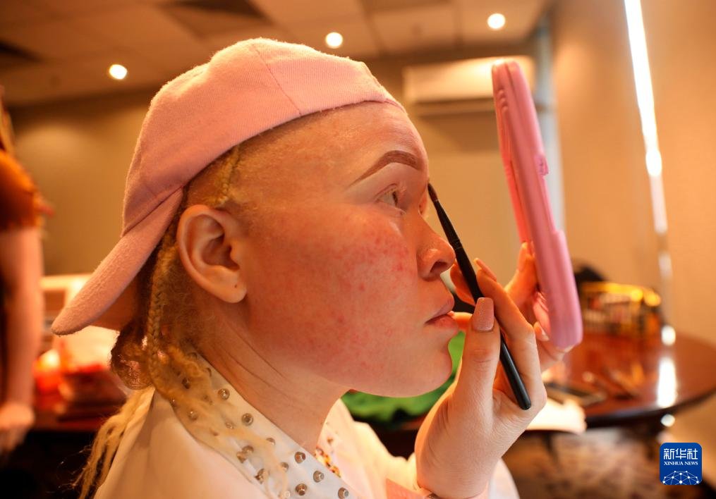 6月28日,一名選手在津巴布韋首都哈拉雷舉行的“非洲白化病先生和小姐”選美比賽前化妝。新華社發(肖恩·朱薩攝)