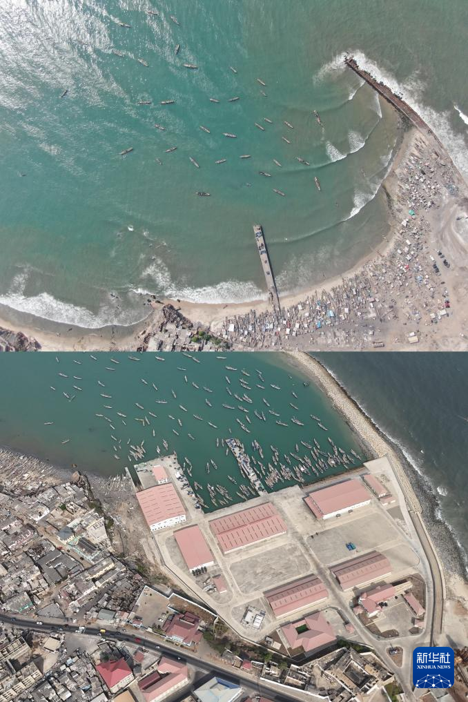 這是中國援建的詹姆斯敦漁港建設前后的航拍對比圖。新華社發(受訪者供圖)