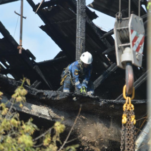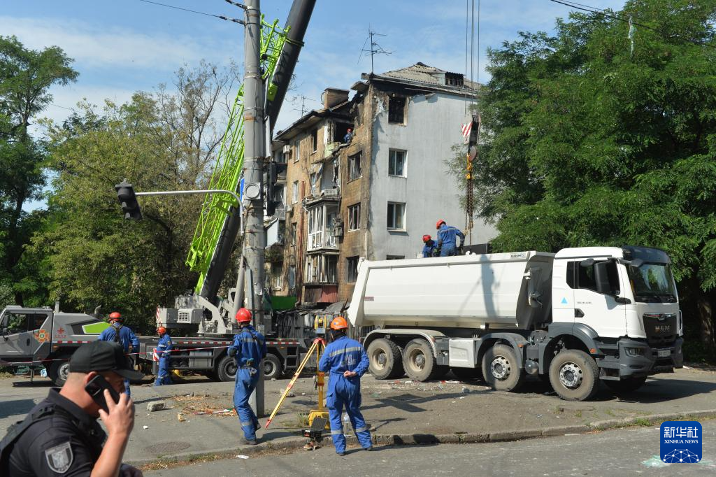 7月10日,在烏克蘭基輔市舍甫琴科夫斯基區,救援人員拆除在空襲中受損的居民樓。