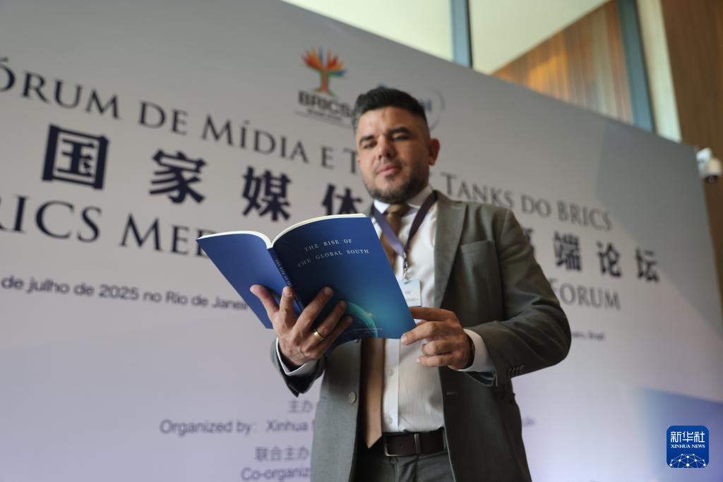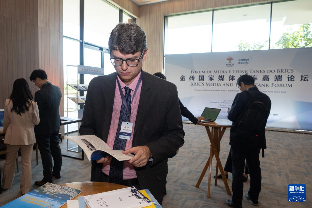 7月16日,在巴西里約熱內盧,嘉賓在金磚國家媒體智庫高端論壇上閱讀《南方崛起》。新華社記者 李夢馨 攝