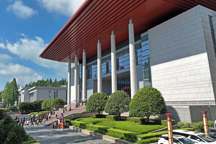 游客進入井岡山革命博物館參觀(2023年6月28日攝,無人機照片)。新華社記者 萬象 攝