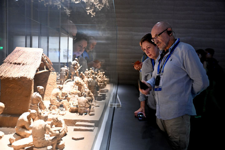 7月23日,上海合作組織媒體智庫峰會與會嘉賓在鄭州商都遺址博物院參觀。新華社記者 朱祥 攝