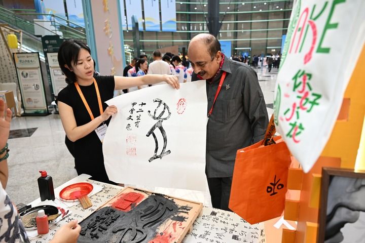 7月25日,與會代表在峰會會場欣賞拓印。新華社記者 郝源 攝