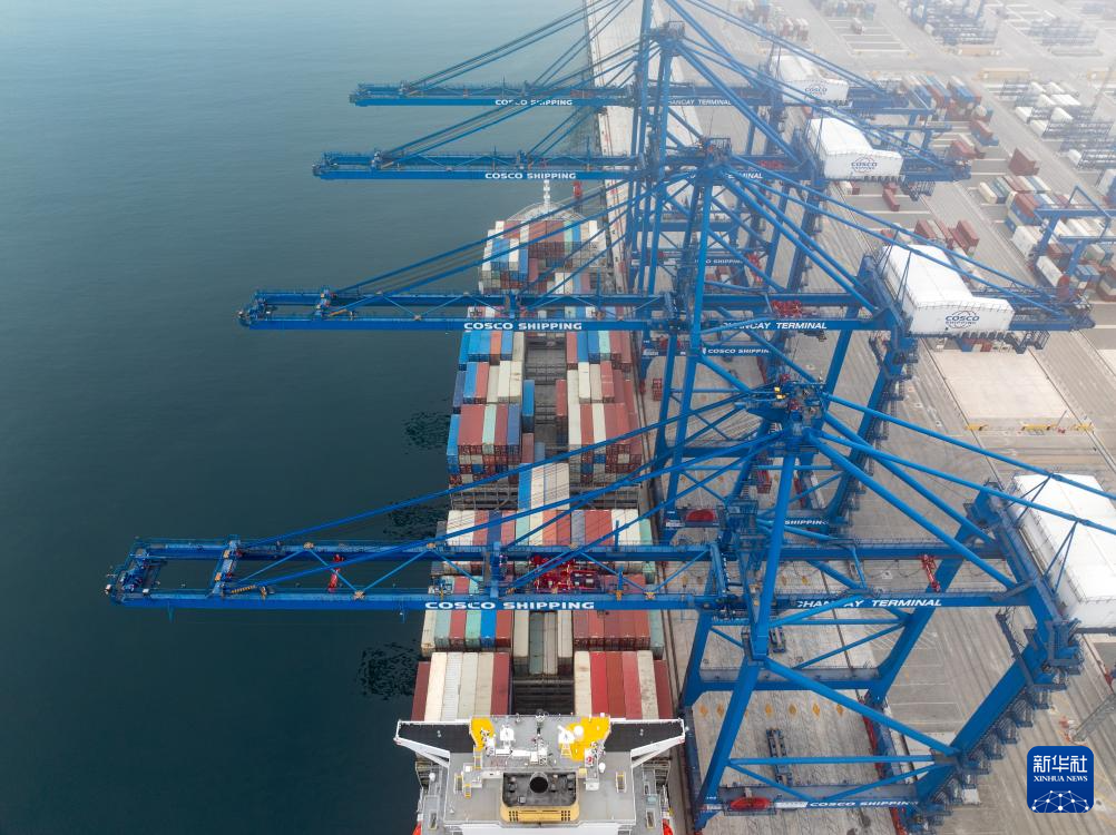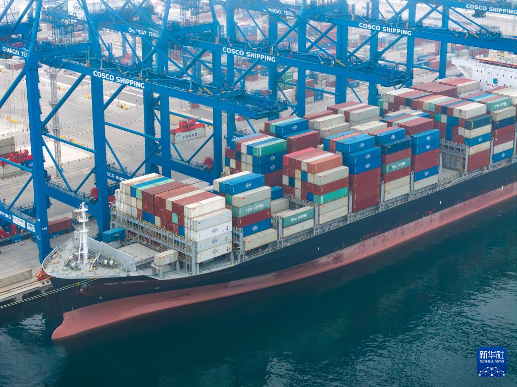 5月16日,在秘魯錢凱港,集裝箱船“金奈”輪??吭?號泊位(無人機照片)。新華社記者 李木子 攝