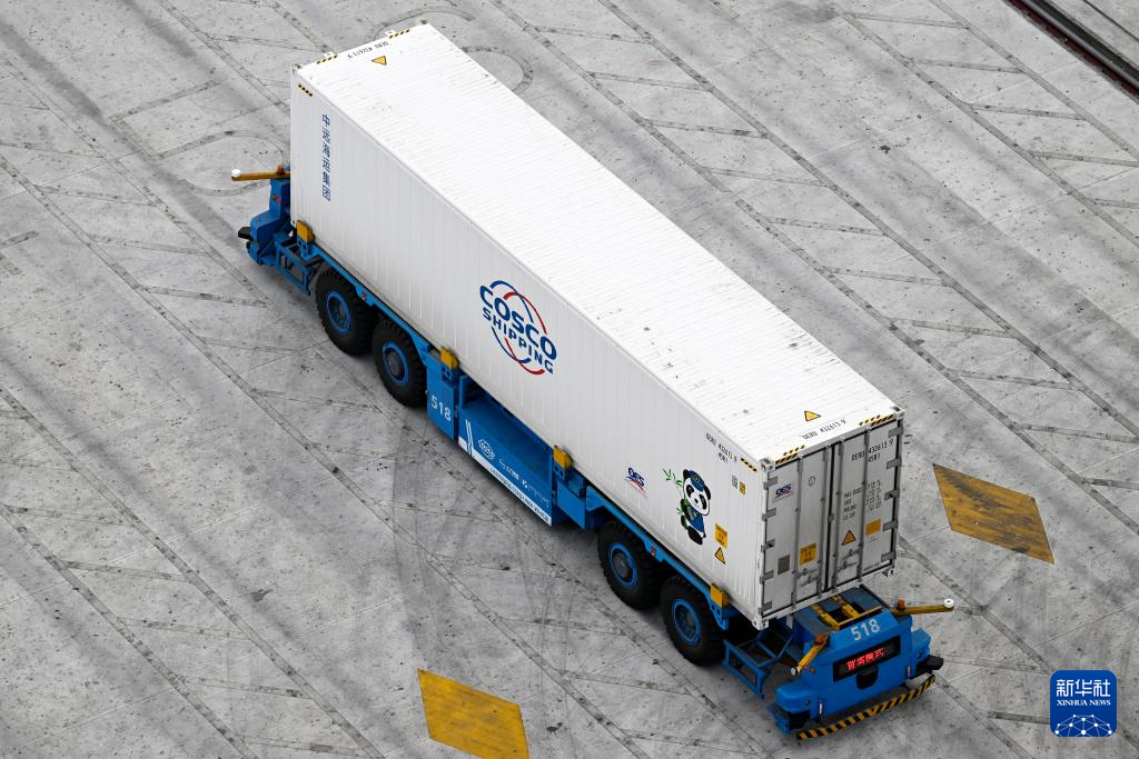 與此同時,錢凱港的“搬運工”智能駕駛集裝箱卡車魚貫而出,遵循系統指令自動列隊。這些無駕駛室的集卡如貼地飛行的魔毯,電力驅動使其能耗較傳統集卡降低25%以上,全程零碳排放。