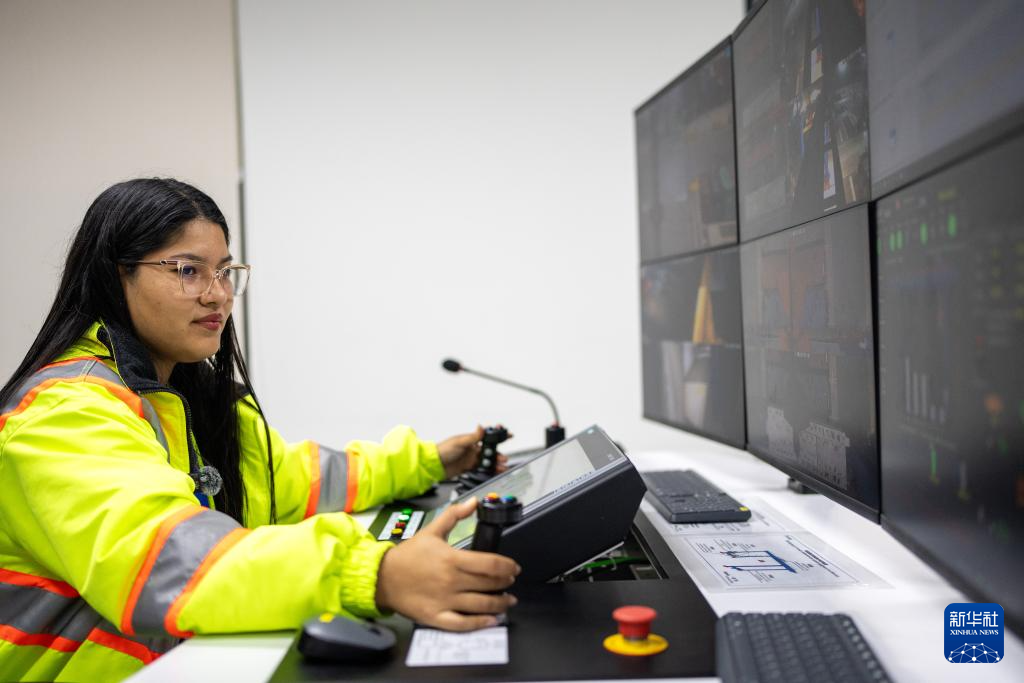 5月15日晚,在秘魯錢凱港,軌道吊操作員克勞迪婭·雷諾索進行作業監控。新華社記者 李木子 攝